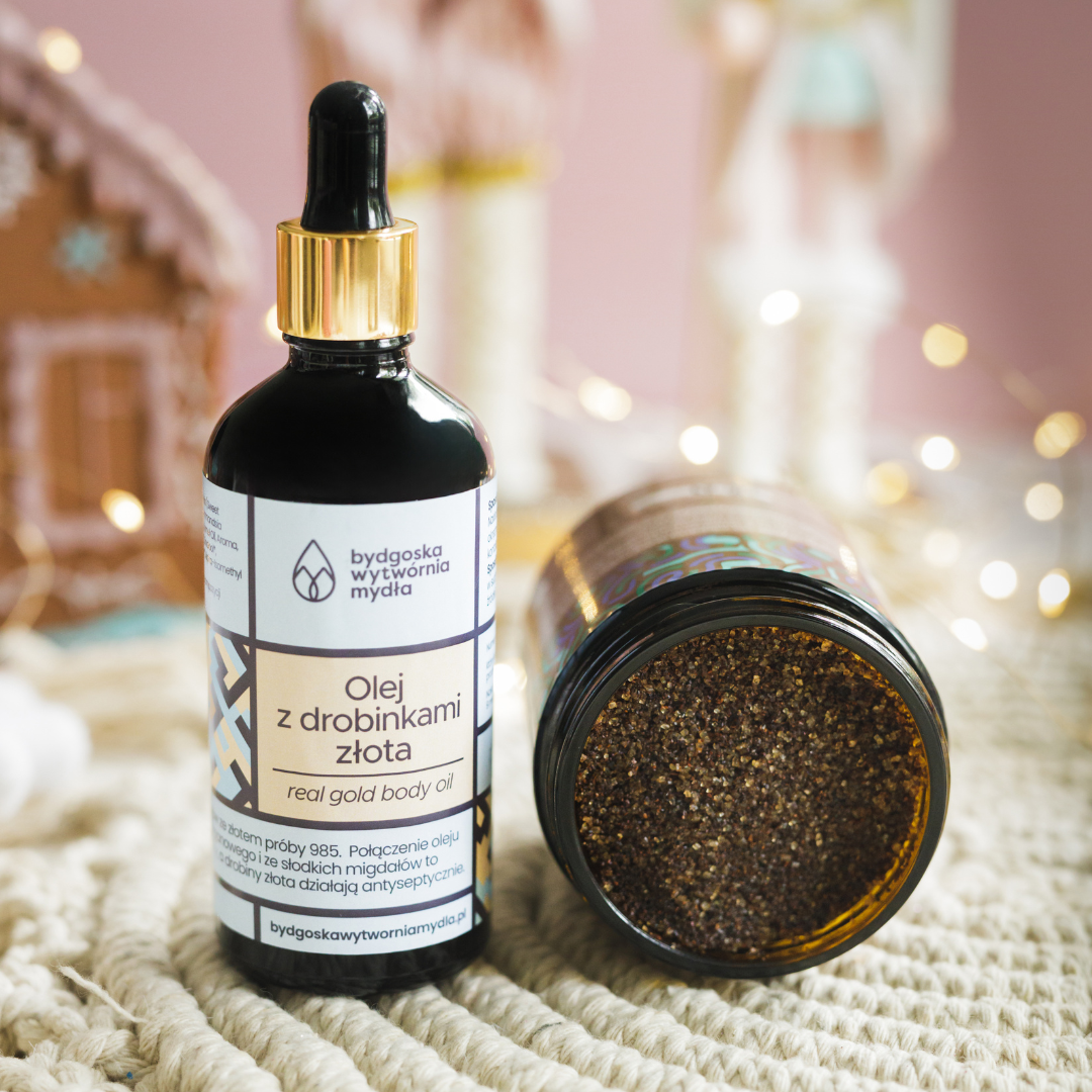 Olej z drobinkami złota zastąpi balsam do ciała w Twojej kosmetyczce. Oleje, które wybraliśmy, działają nawilżająco, złoto kosmetyczne ma właściwości antyseptyczne, a zapach działa na zmysły.