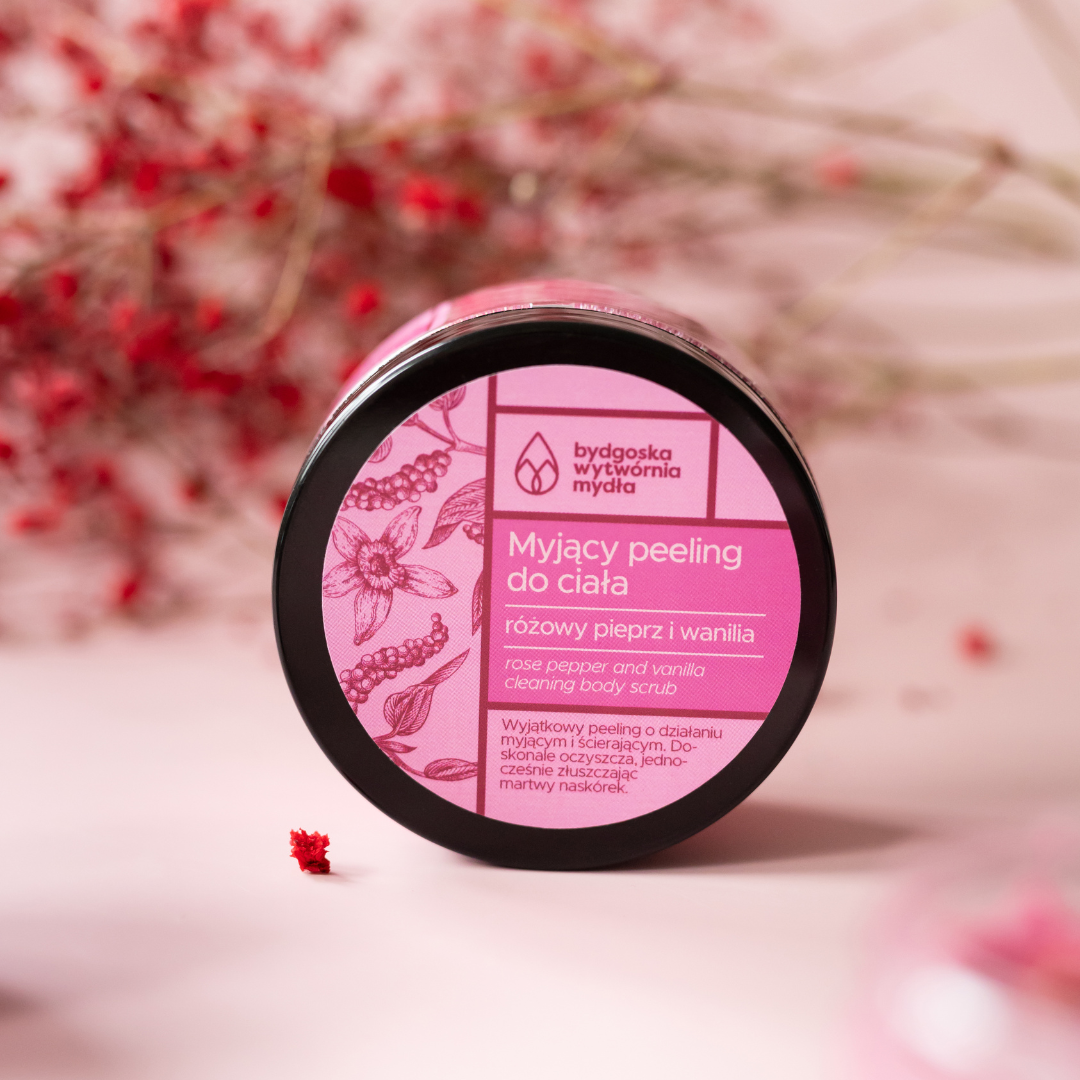 Peeling myjący do ciała różowy pieprz i wanilia to aromatyczne szaleństwo zamknięte w formie naszego bestsellerowego peelingu. Peeling myjący dokładnie pozbywa się martwego naskórka pozostawiając skórę gładką i miękką - dodatkową zaletą jest brak tłustego filmu! Peeling myjący jednocześnie myje i szoruje, nie zostawiając na skórze tłustej warstwy.