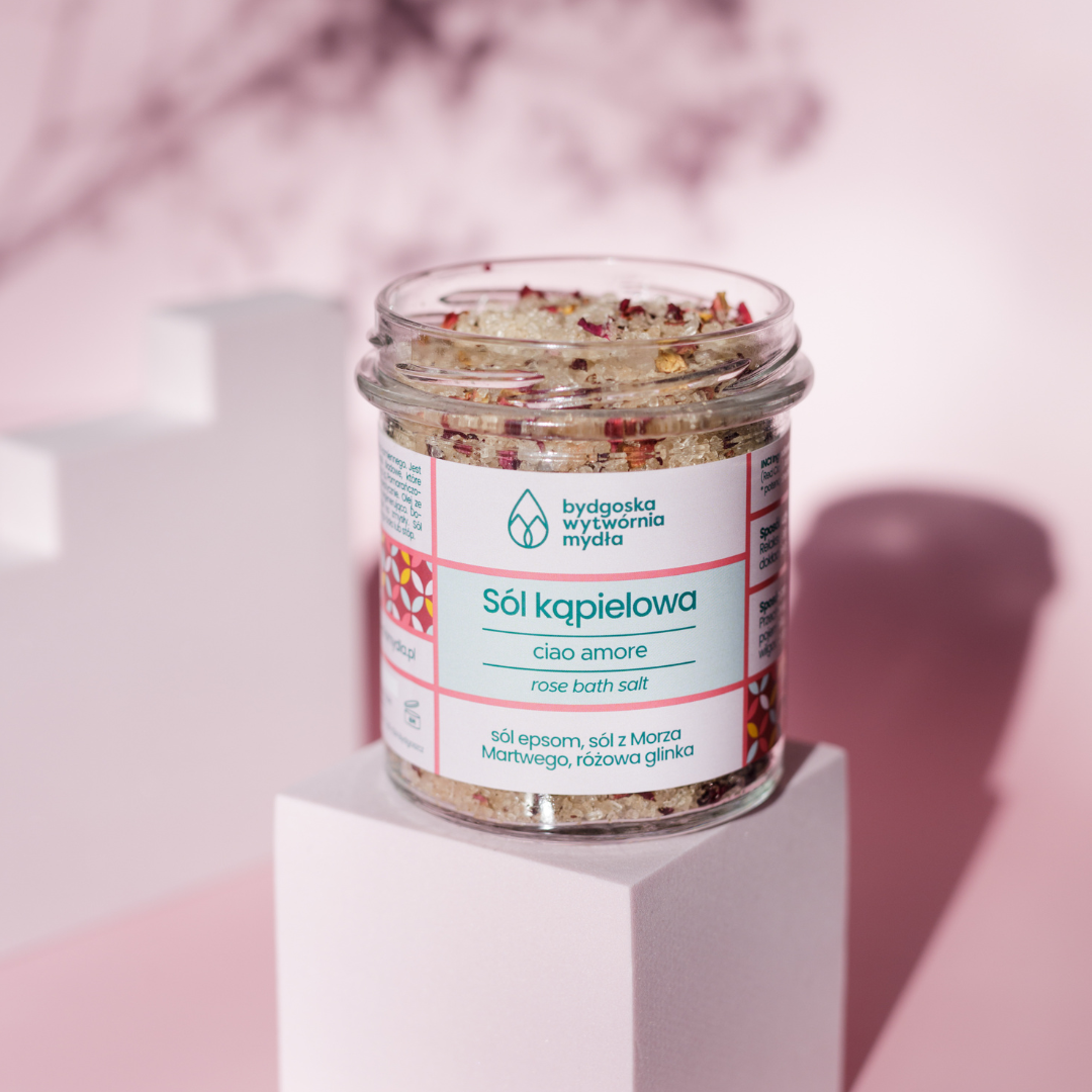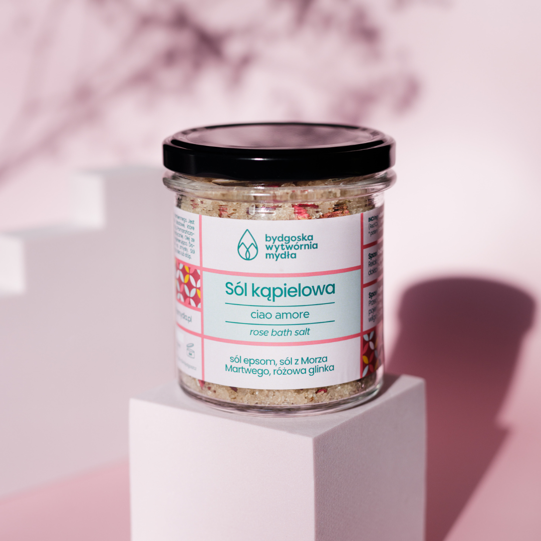 Sól kąpielowa Ciao Amore to pachnący i dekoracyjny dodatek do Twojej łazienki. Połączenie dwóch typów soli, które korzystnie wpływają na samopoczucie oraz skórę. Sól z Morza Martwego bogata jest w sód i magnez, zmiękcza skórę i ma działanie relaksujące. Sól epsom poprawia kondycję skóry, kąpiel z jej dodatkiem pomaga redukować stres i rozluźnia. Dodatek olejku zapachowego działa na zmysły.