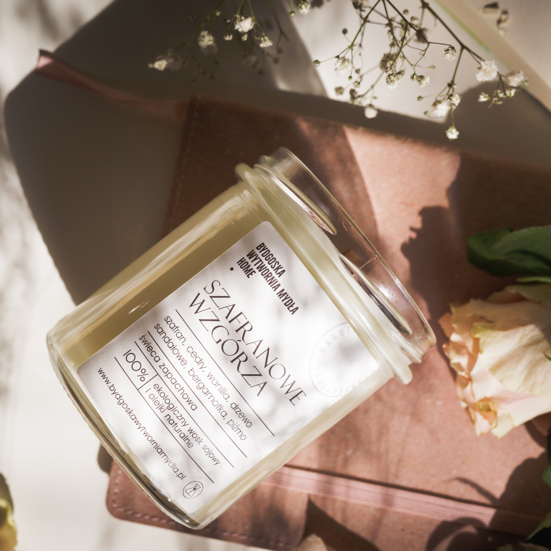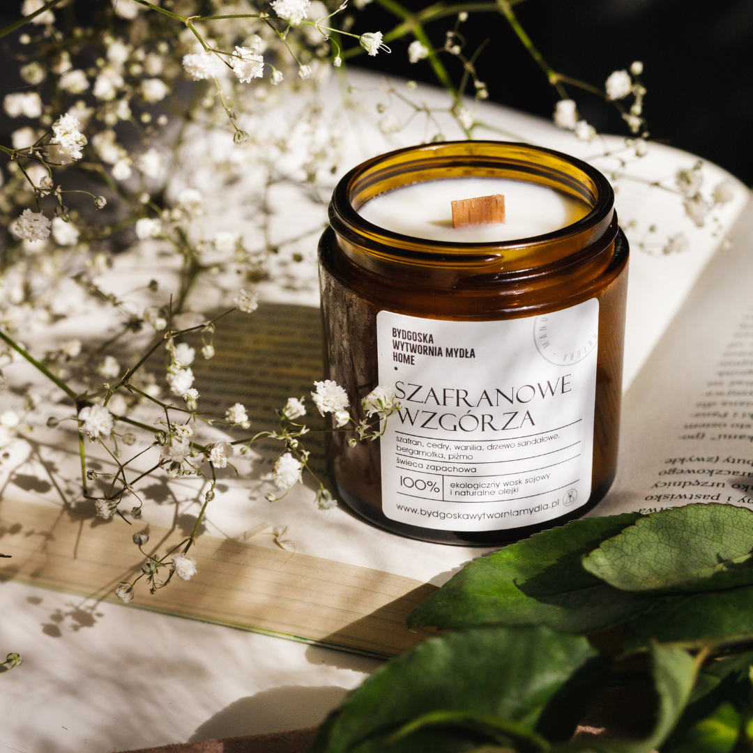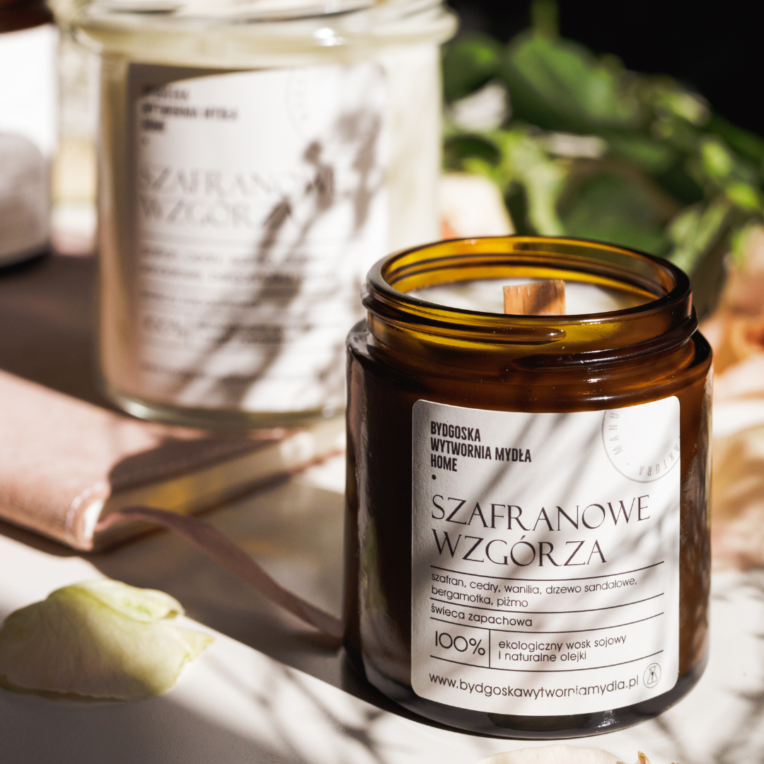 Świeca sojowa Szafranowe Wzgórza to wyrafinowane połączenie szafranu, cedru, drzewa herbacianego i bergamotki wzbogacone nutą wanilii i piżma. Głębokie, harmonijne doznanie wprowadzi spokój i harmonię w pomieszczeniu.