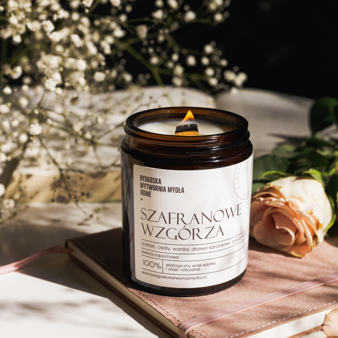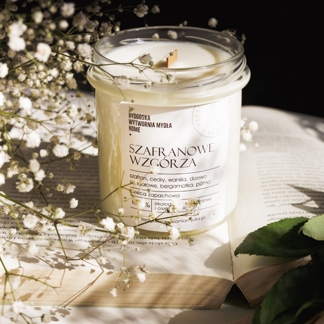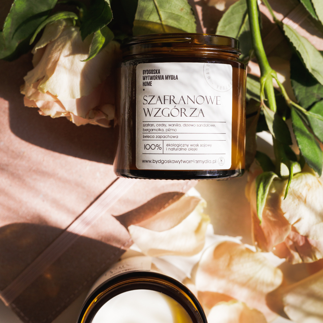 Świeca sojowa Szafranowe Wzgórza to wyrafinowane połączenie szafranu, cedru, drzewa herbacianego i bergamotki wzbogacone nutą wanilii i piżma. Głębokie, harmonijne doznanie wprowadzi spokój i harmonię w pomieszczeniu.