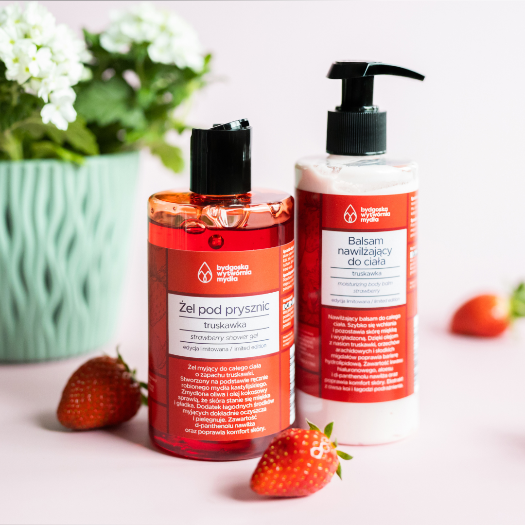 Żel pod prysznic o zapachu truskawki jest stworzony na podstawie ręcznie robionego mydła kastylijskiego. Zmydlona oliwa i olej kokosowy sprawiają, że skóra stanie się miękka i gładka. Dodatek łagodnych środków myjących dokładnie oczyszcza i pielęgnuje. Zawartość d-panthenolu nawilża oraz poprawia komfort skóry. Aromatyczny zapach soczystej truskawki idealnie się sprawdzi się na lato.